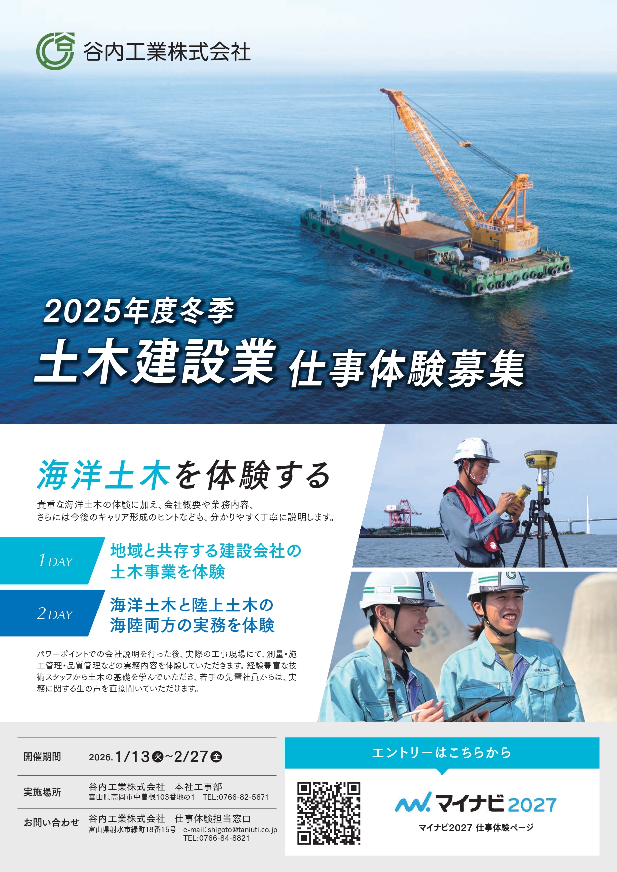 谷内工業株式会社では、海洋土木の役割と魅力を知っていただける冬季仕事体験を開催いたします。